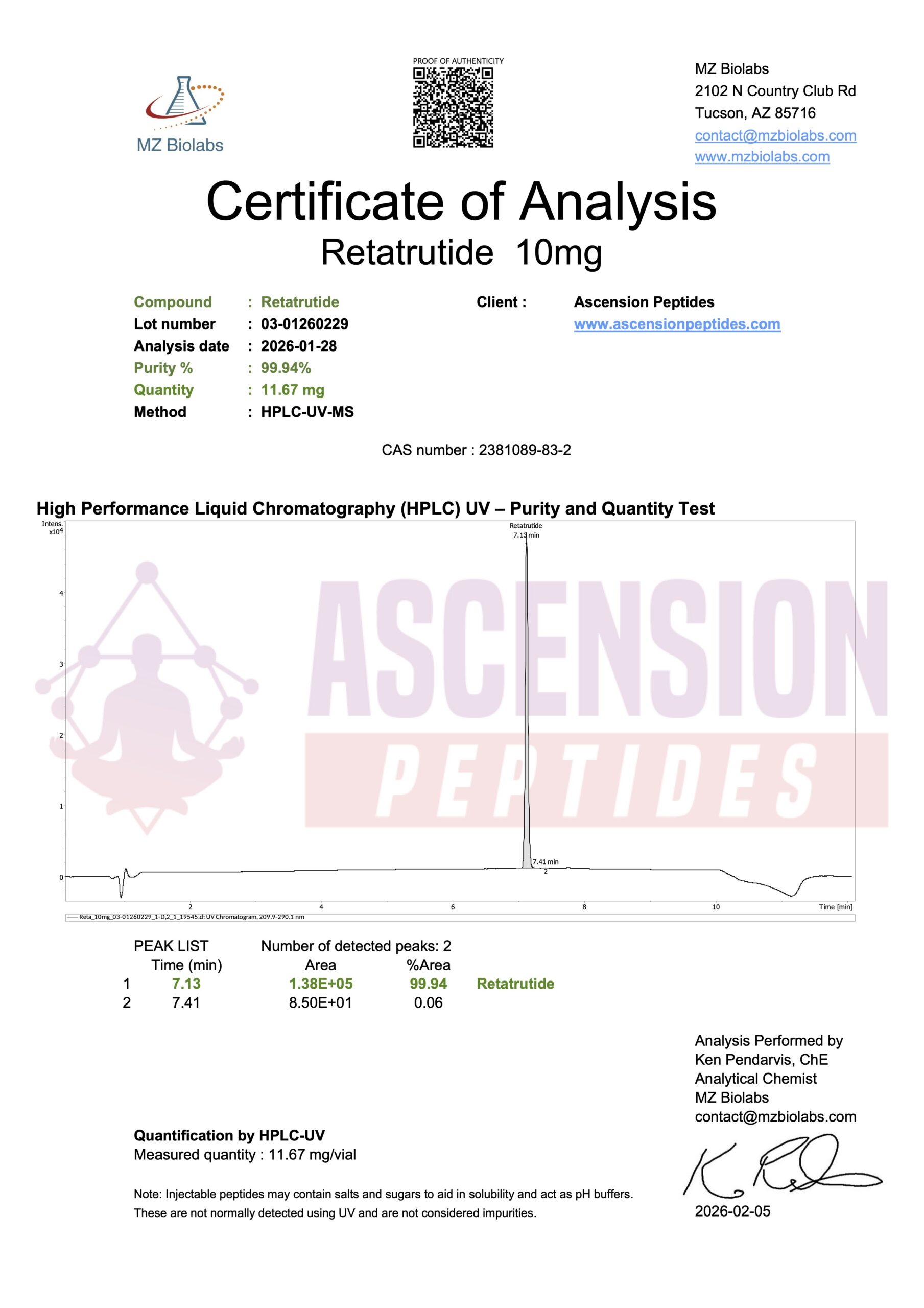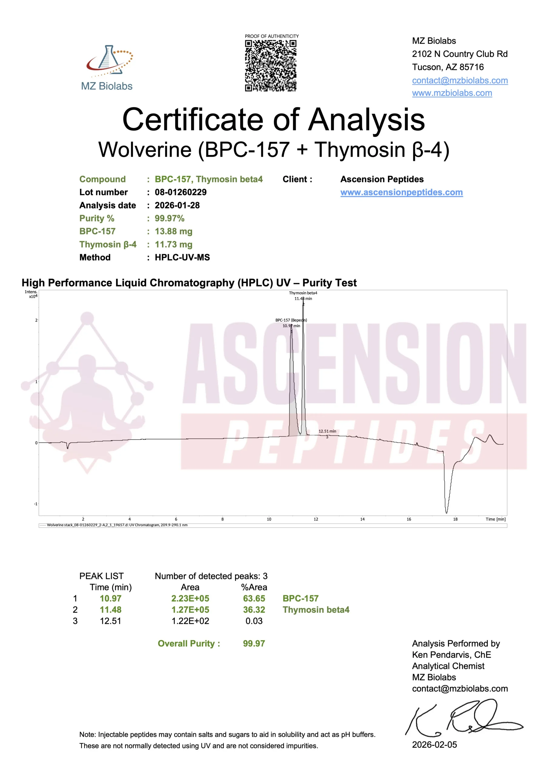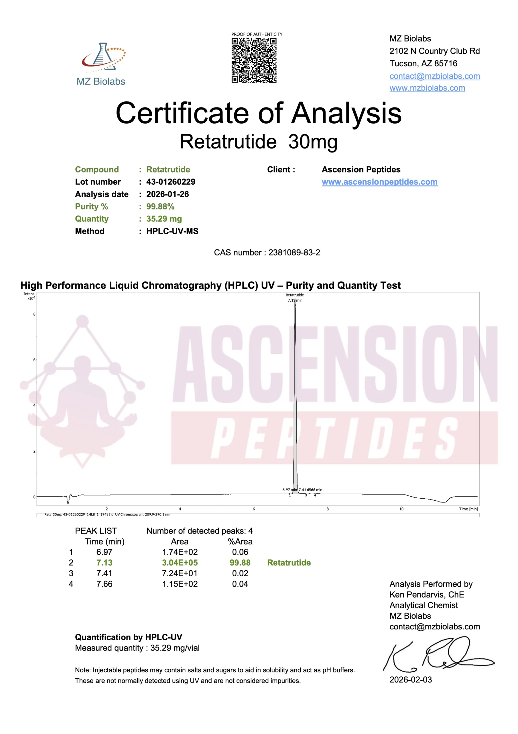 Ascension Peptides tests all products with an independent third-party lab located in the United States. All Certificates of Analysis are displayed here after testing is complete.